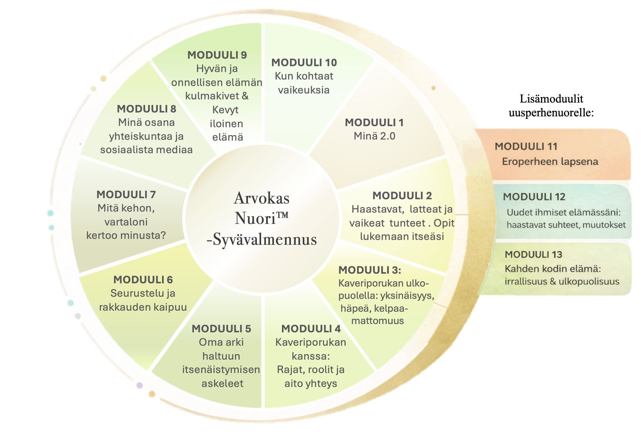 Moduulit vievät läpi teemoja, jotka oikeasti koskettavat tämän päivän nuorta: tunteet ja ahdistus, rakkaus ja ihmissuhteet, identiteetti, keho, sosiaalinen media, arjen hallinta, unelmat, vaikeudet, oma jaksaminen ja keveyden löytäminen. Lisäksi syvävalmennuksessa on kolmen moduulin lisäosa nuorille jotka elävät uusperheessä.